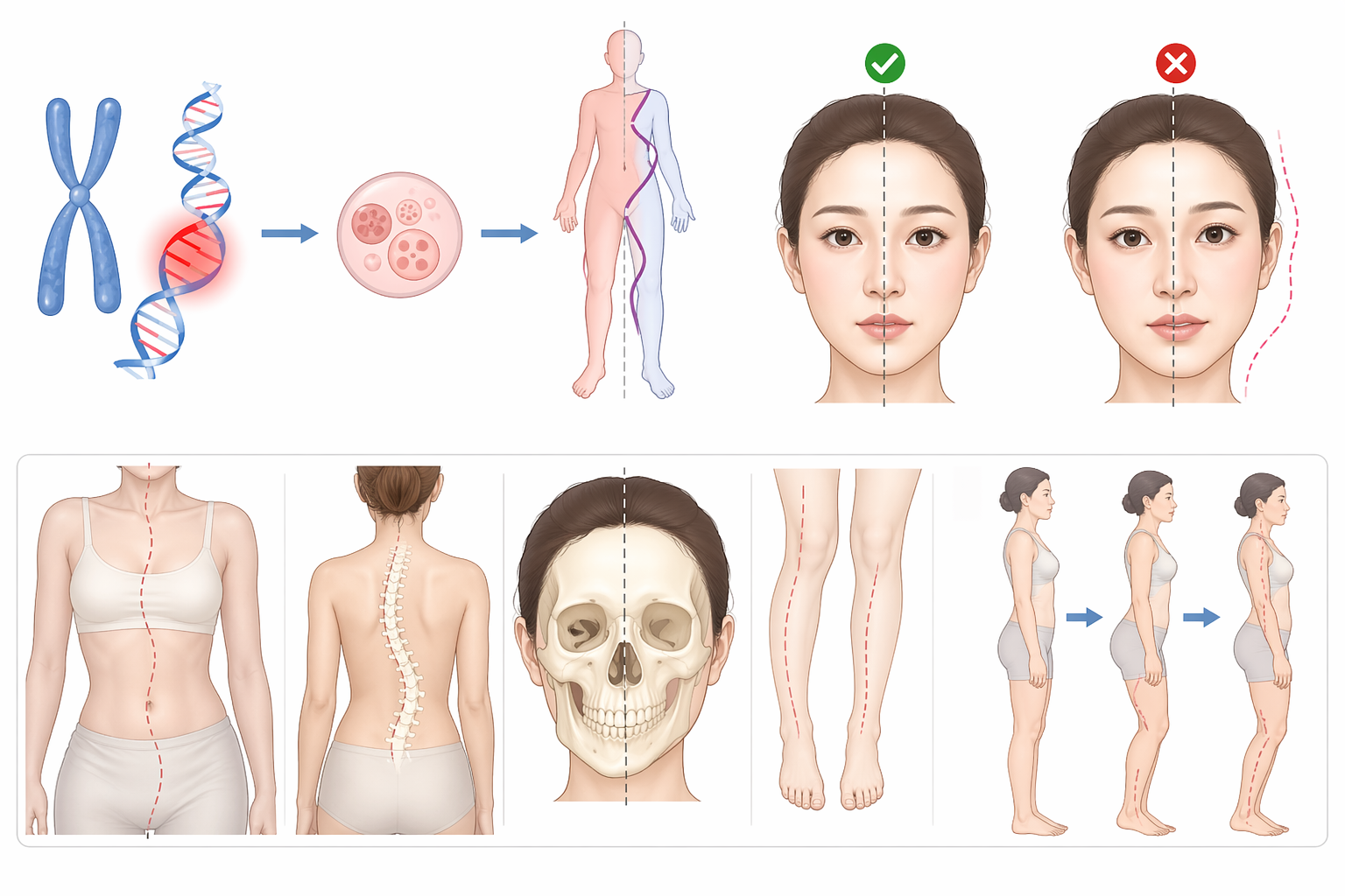 Tình trạng đột biến NST dạng ziczac thường liên quan đến sự phân bố bất thường của mô mềm, mỡ và xương trong quá trình phát triển. Hậu quả là các vùng trên cơ thể, đặc biệt là khuôn mặt không cân xứng, ảnh hưởng đến thẩm mỹ và chức năng sinh lý.