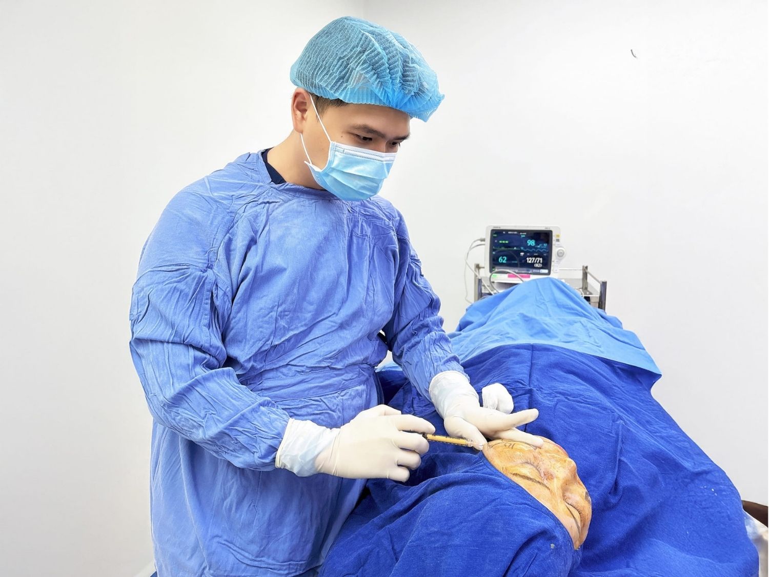Bác sĩ tiến hành đo vẽ chính xác các vùng sẽ lấy mỡ và cấy mỡ, đảm bảo quá trình thực hiện diễn ra chính xác và nhanh chóng.