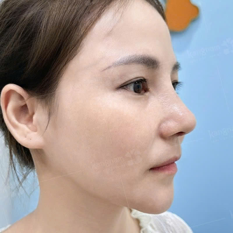Mũi chỉ còn sưng nhẹ, form mũi đang trong quá trình định hình. Đường sống mũi chưa thật sự rõ nét nhưng tổng thể khuôn mặt đã cân đối hơn.