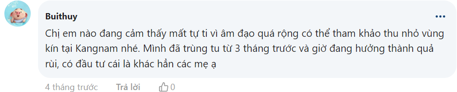 “Chị em nào đang cảm thấy mất tự ti vì âm đạo quá rộng có thể tham khảo thu nhỏ vùng kín tại Kangnam nhé. Mình đã trùng tu từ 3 tháng trước và giờ đang hưởng thành quả rùi, có đầu tư cái là khác hẳn các mẹ ạ.”- Chị Bùi Thúy chia sẻ niềm vui sau khi thu nhỏ âm đạo.