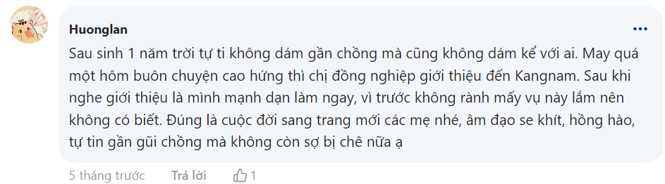 “Sau sinh 1 năm trời tự ti không dám gần chồng mà cũng không dám kể với ai. May quá một hôm buôn chuyện cao hứng thì chị đồng nghiệp giới thiệu đến Kangnam. Sau khi nghe giới thiệu là mình mạnh dạn làm ngay, vì trước không rành mấy vụ này lắm nên không có biết. Đúng là cuộc đời sang trang mới các mẹ nhé, âm đạo se khít, hồng hào, tự tin gần gũi chồng mà không còn sợ bị chê nữa ạ.” – Bạn Hương Lan chia sẻ.
