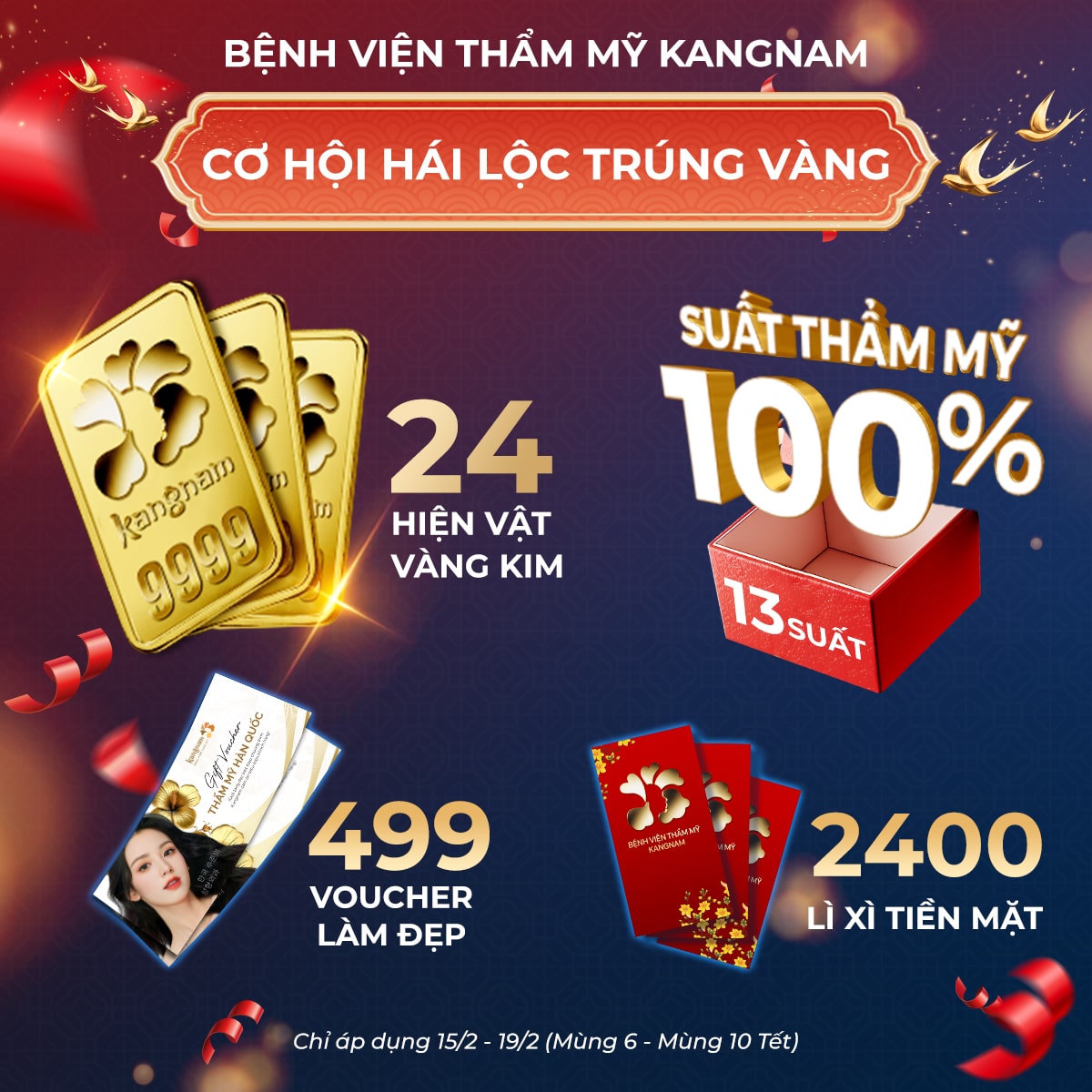 Năm mới khai xuân, Bệnh viện Thẩm mỹ Kangnam dành tặng khách hàng chương trình khuyến mãi “Khai Xuân Độ Sắc – Làm Đẹp Nhận Vàng” với ưu đãi lên đến 30% các dịch vụ thẩm mỹ cũng như cơ hội tham gia chương trình “Hái lộc nhận vàng” tại các cơ sở thẩm mỹ của Kangnam trên toàn quốc.