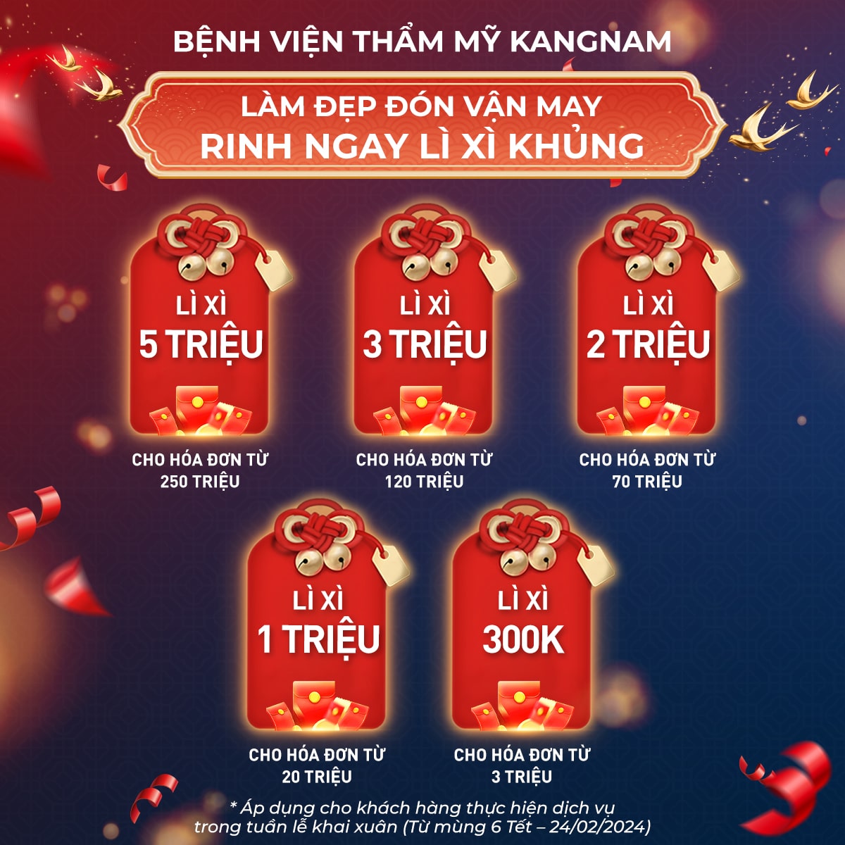 Nhân dịp tết đến xuân sang, mỗi khách hàng đặt cọc thực hiện các dịch vụ thẩm mỹ TRƯỚC NGÀY mùng 3 Tết (12/01/2024) tại Kangnam sẽ nhận ngay lì xì tiền mặt: